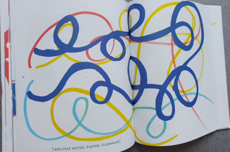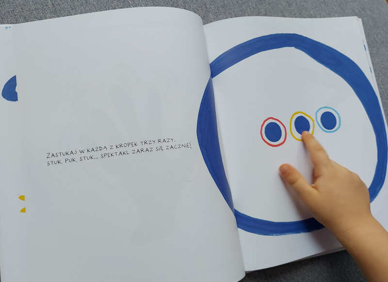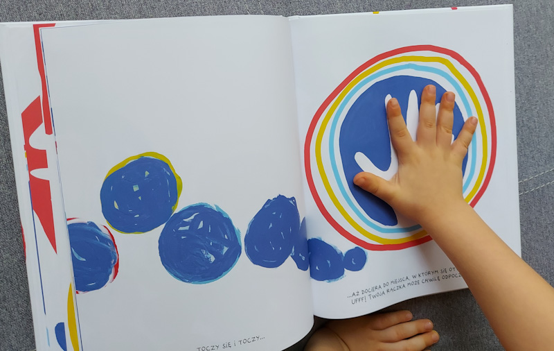 Autor od pierwszej do ostatniej strony angażuje czytelnika i wciąga do zabawy - mała rączka rozgrzewa się najpierw by póżniej szaleć na kolejnych stronach. Musi skakać, zwijać się w kamyk, toczyć, latać, falować, wywijać pętelki. Na szczęście są również chwile odpoczynku :).