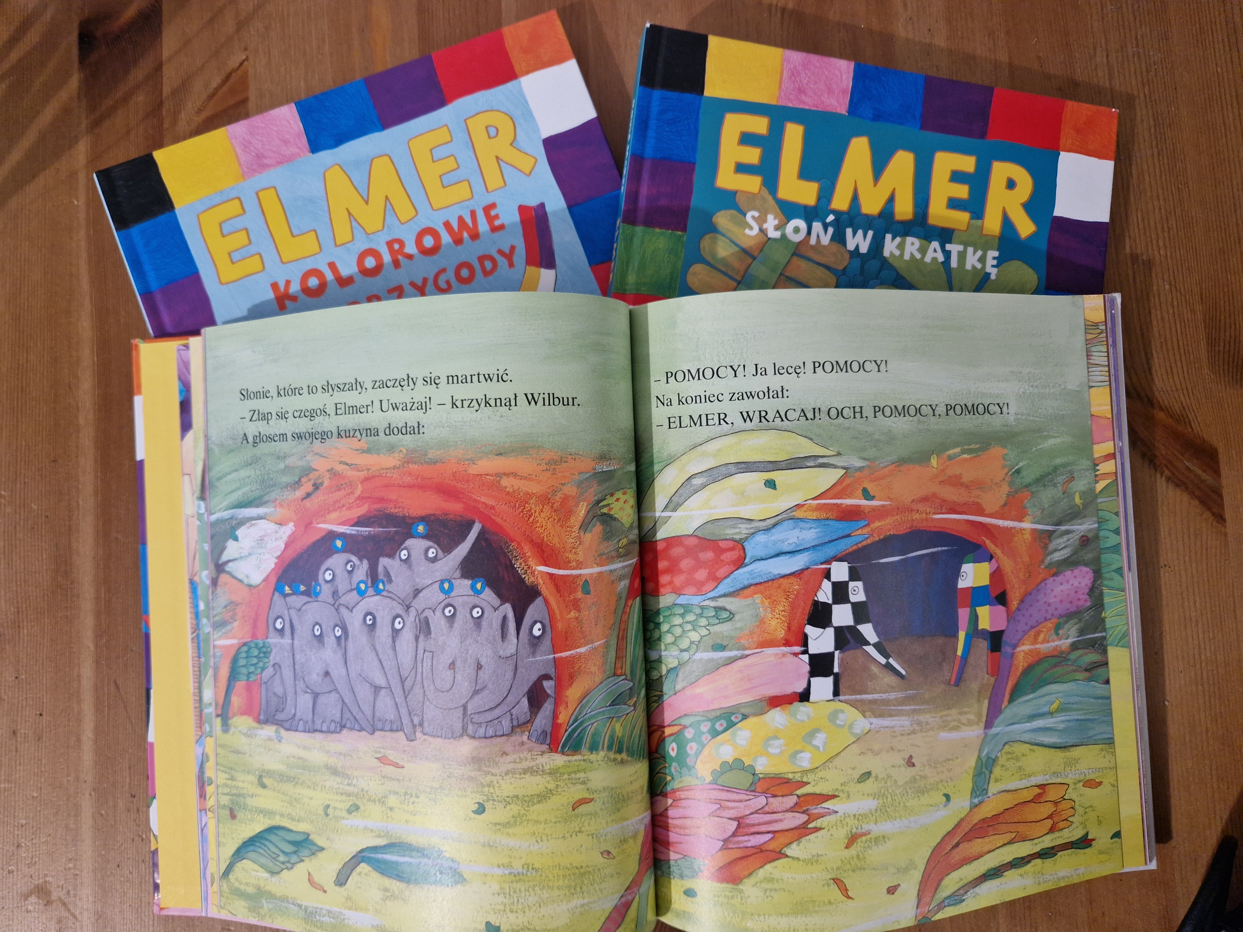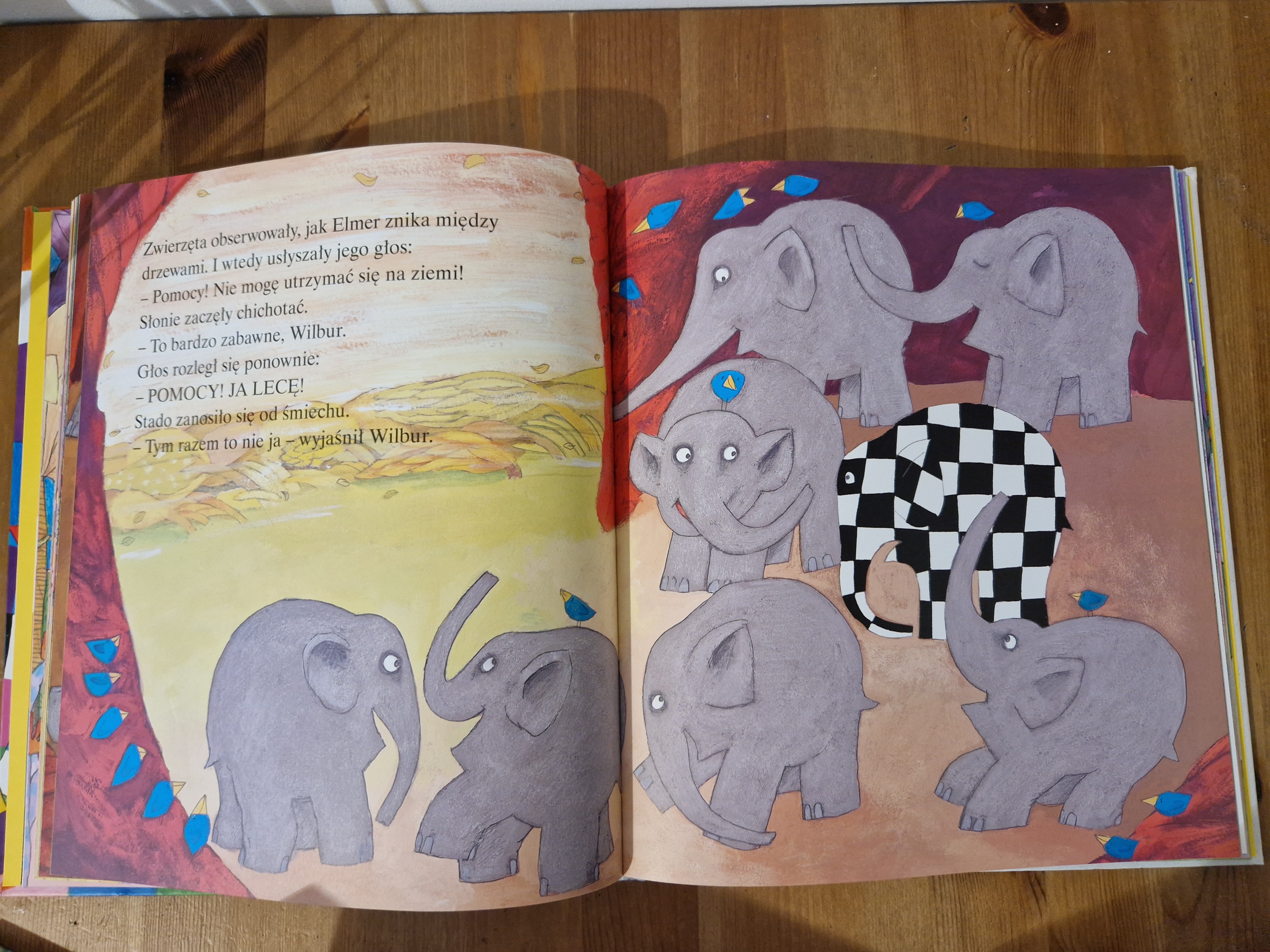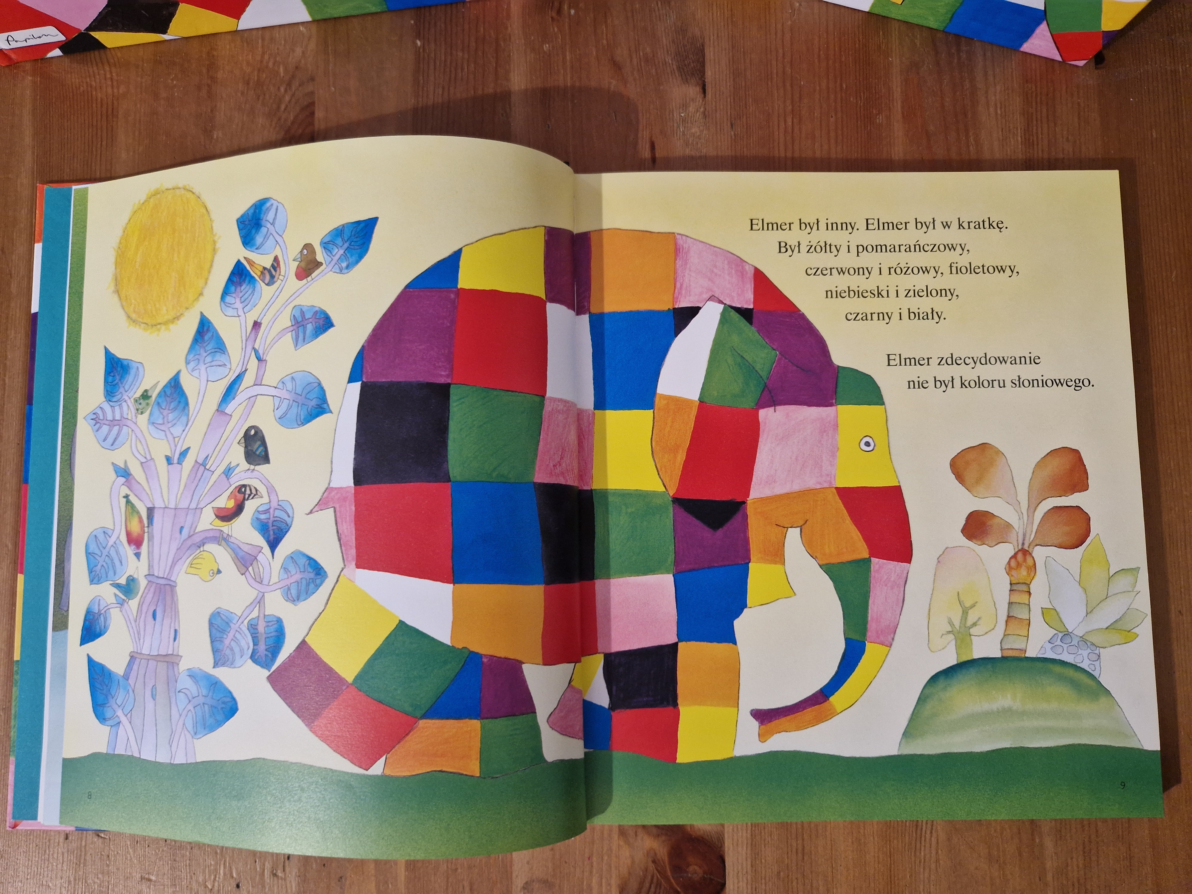 "Elmer był inny. Elmer był w kratkę. Był żółty i pomarańczowy, czerwony i różowy, fioletowy, niebieski i zielony, czarny i biały. Elmer zdecyzdowanie nie był koloru słoniowego".