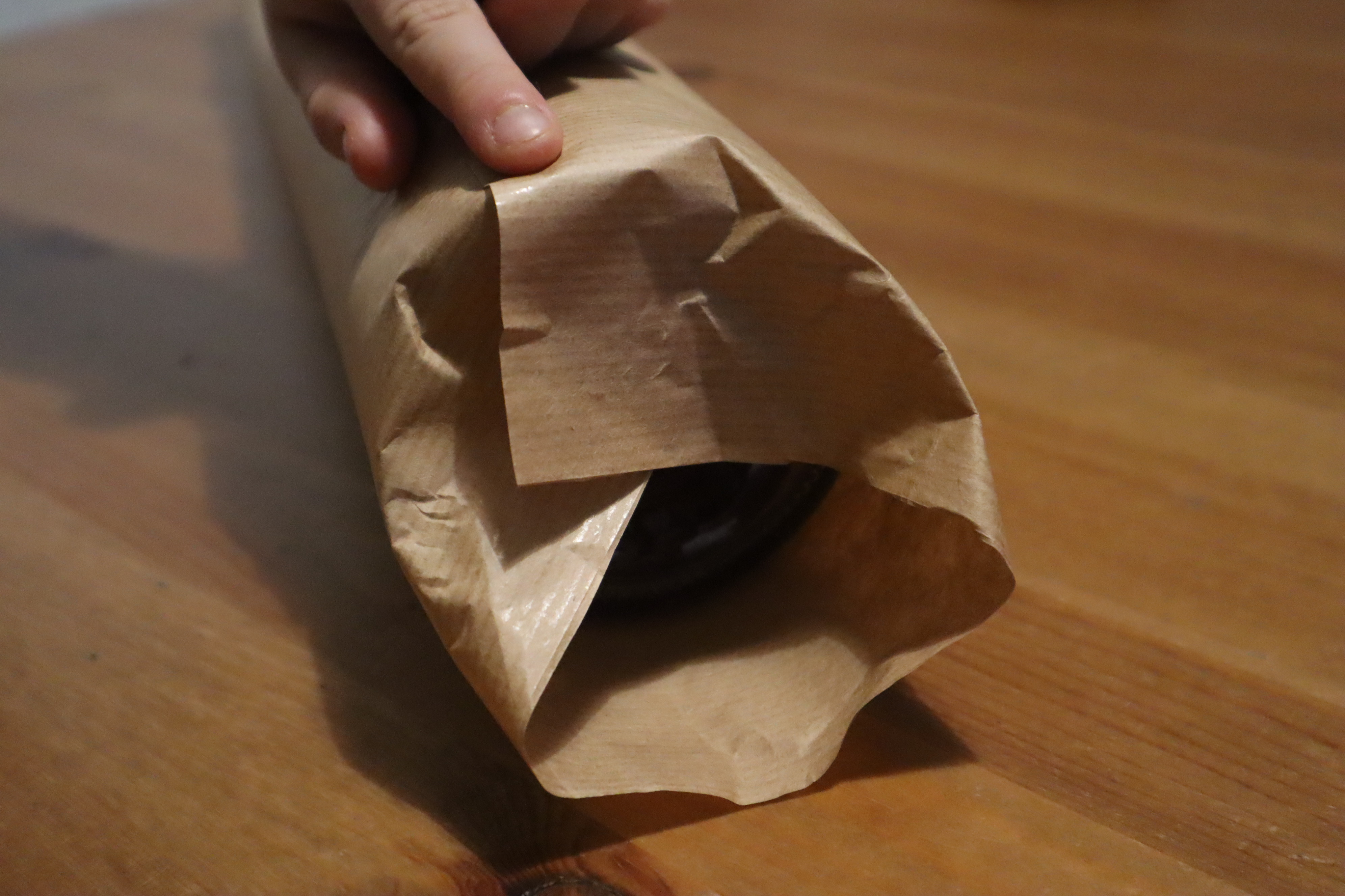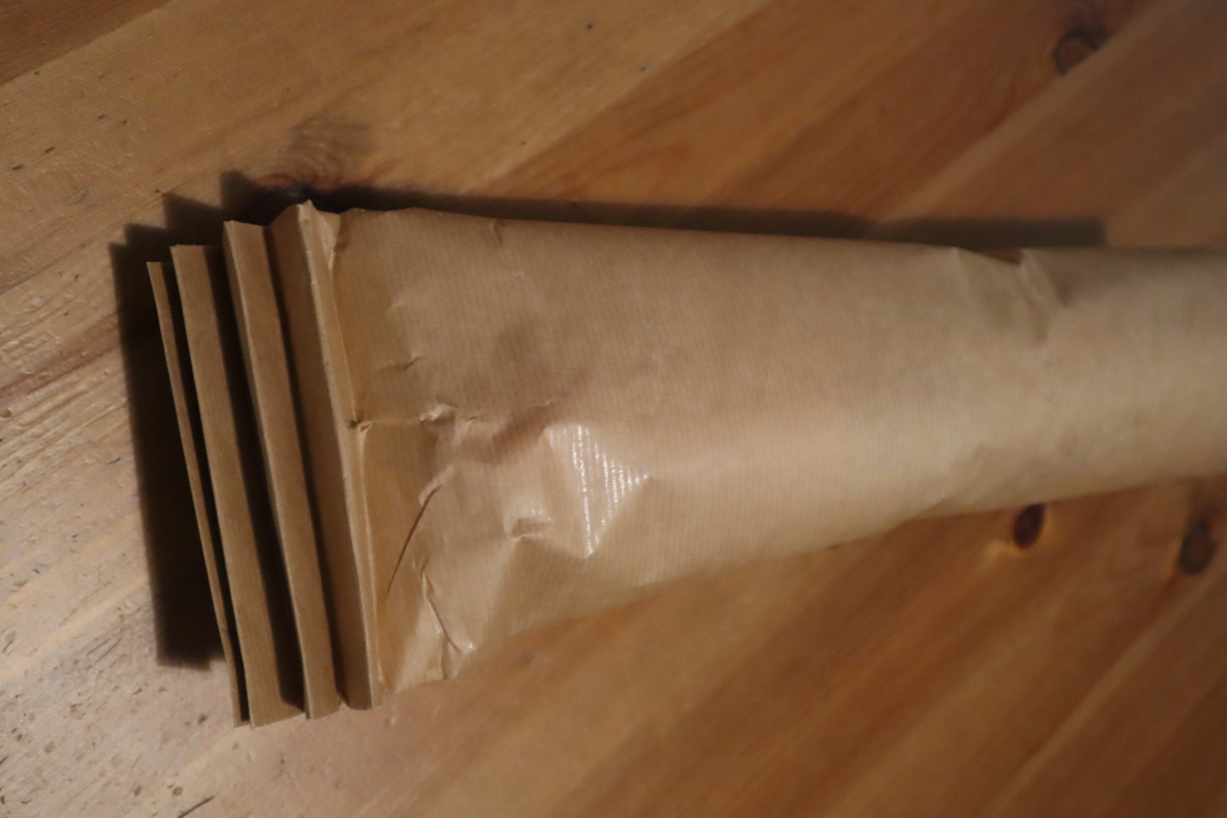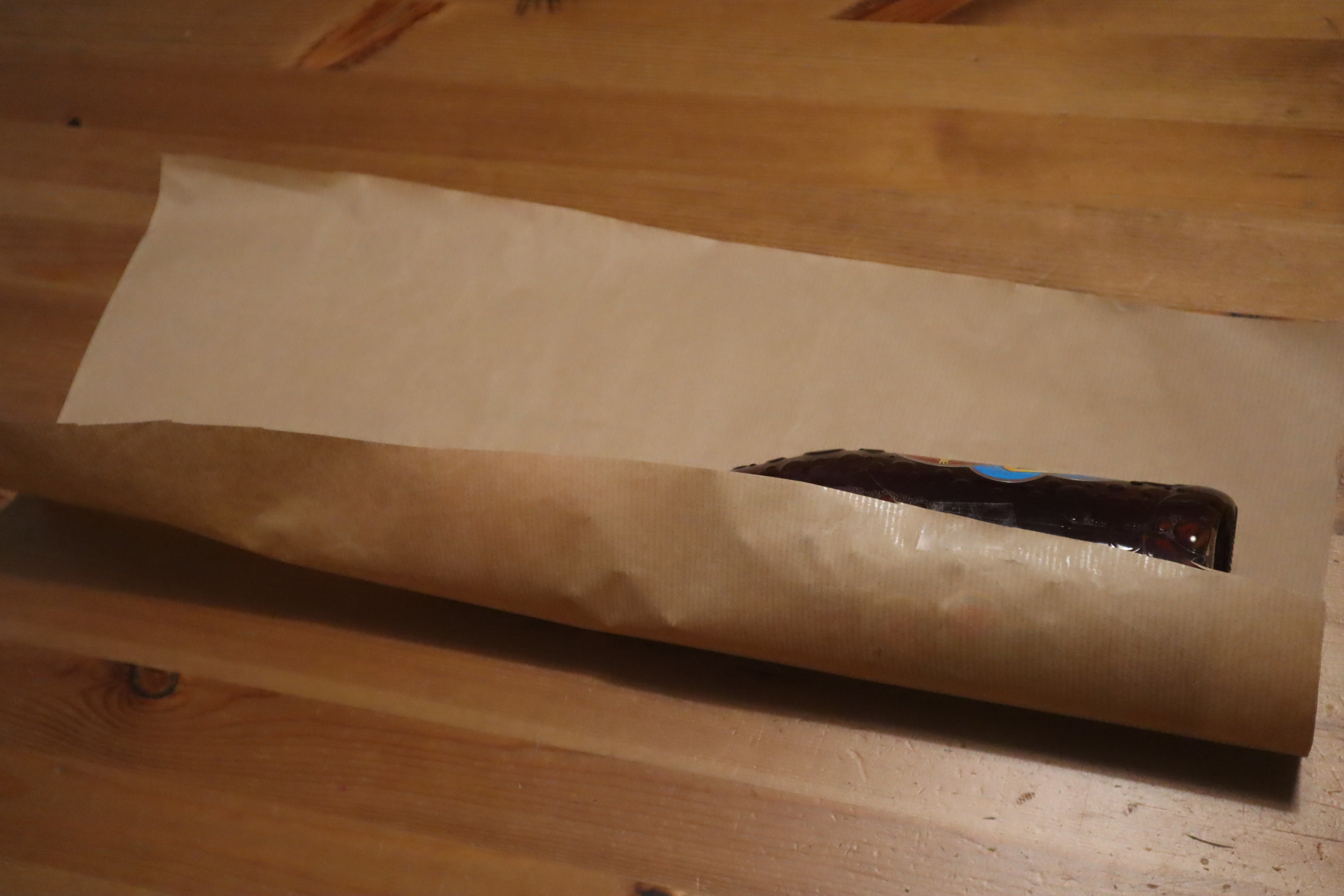 Krok 2 - układacie butelkę na jednym końcu i zawijacie w papier - zapezpieczacie taśmą na całej długości by powstała tuba o średnicy denka butelki.