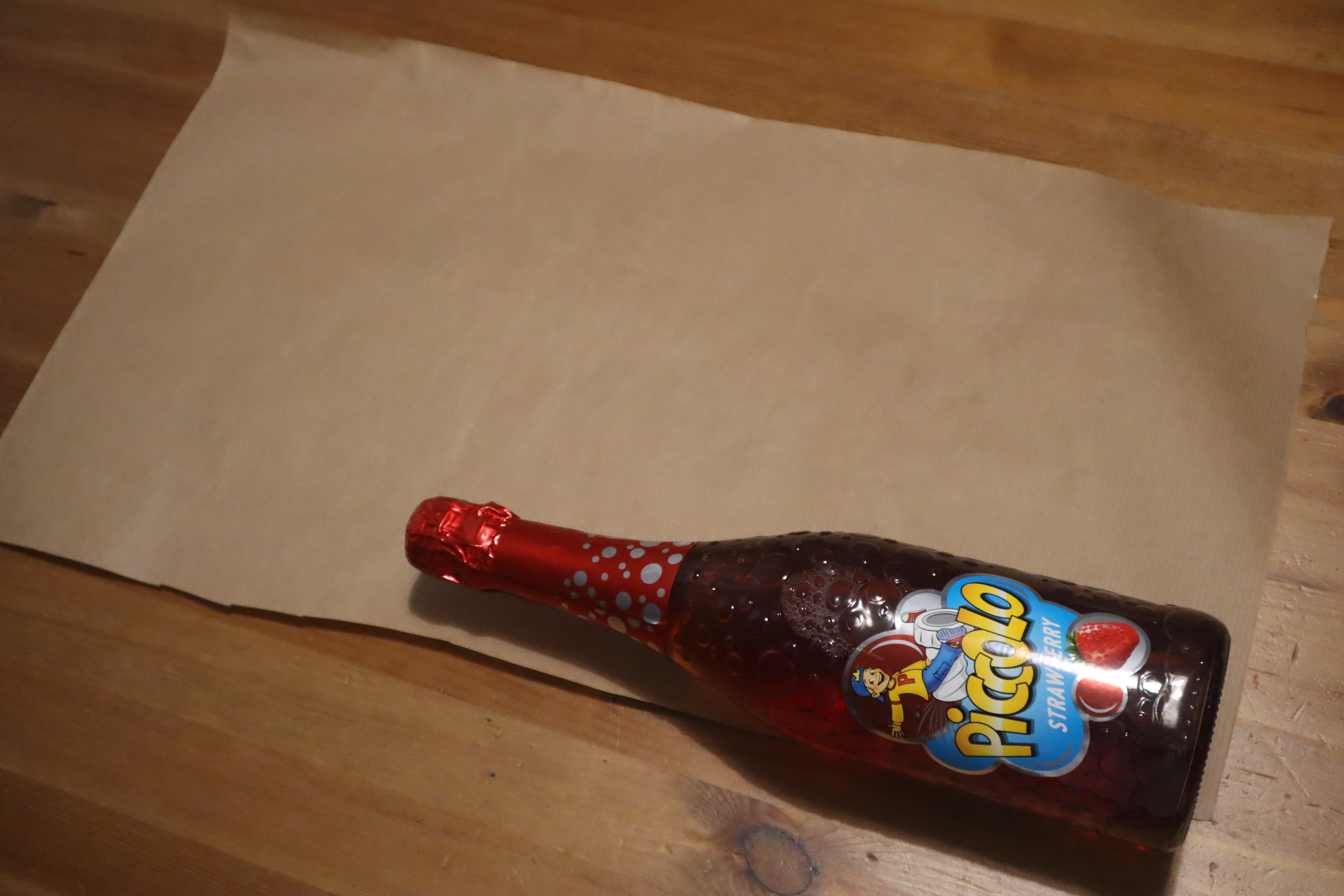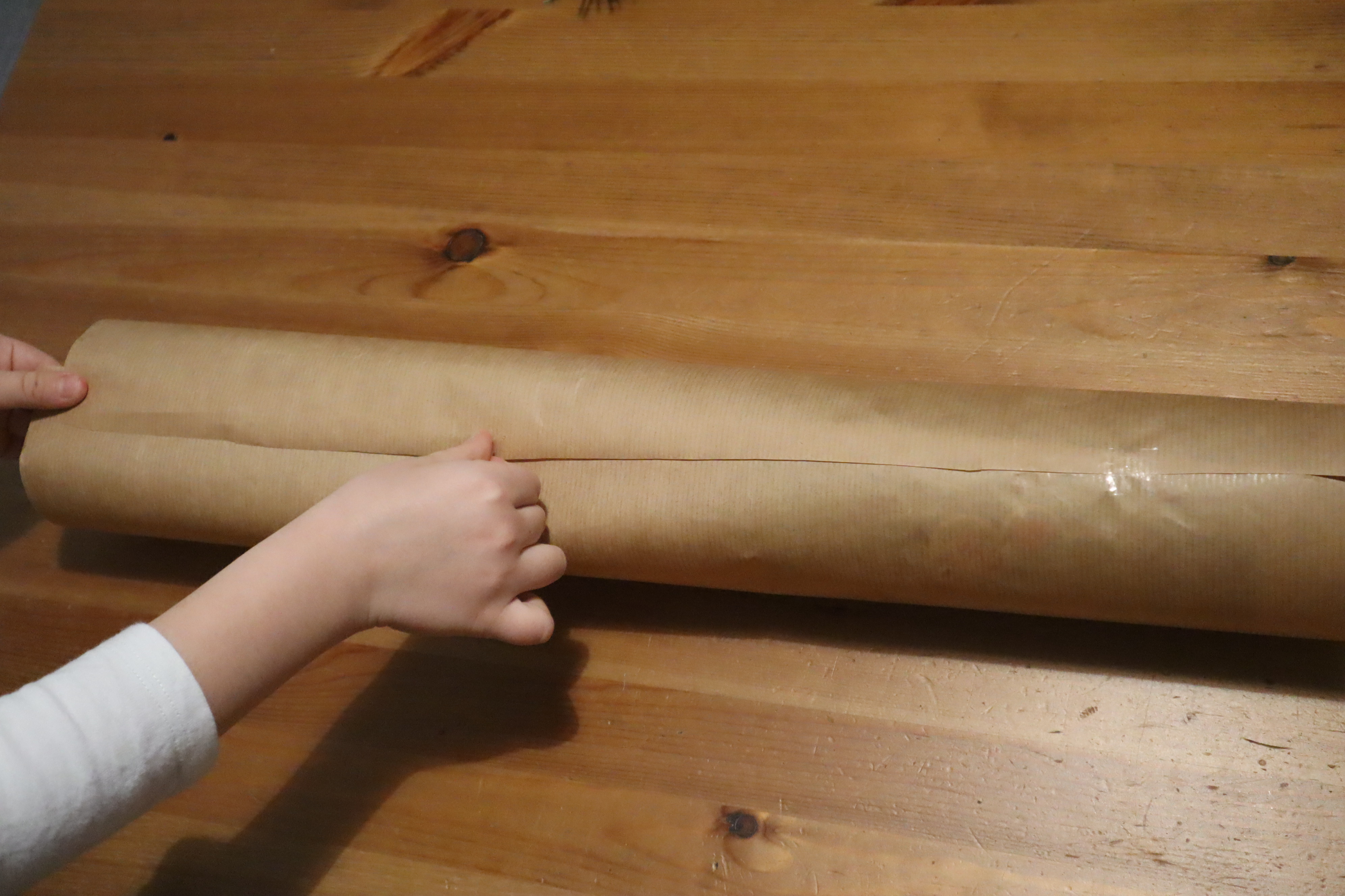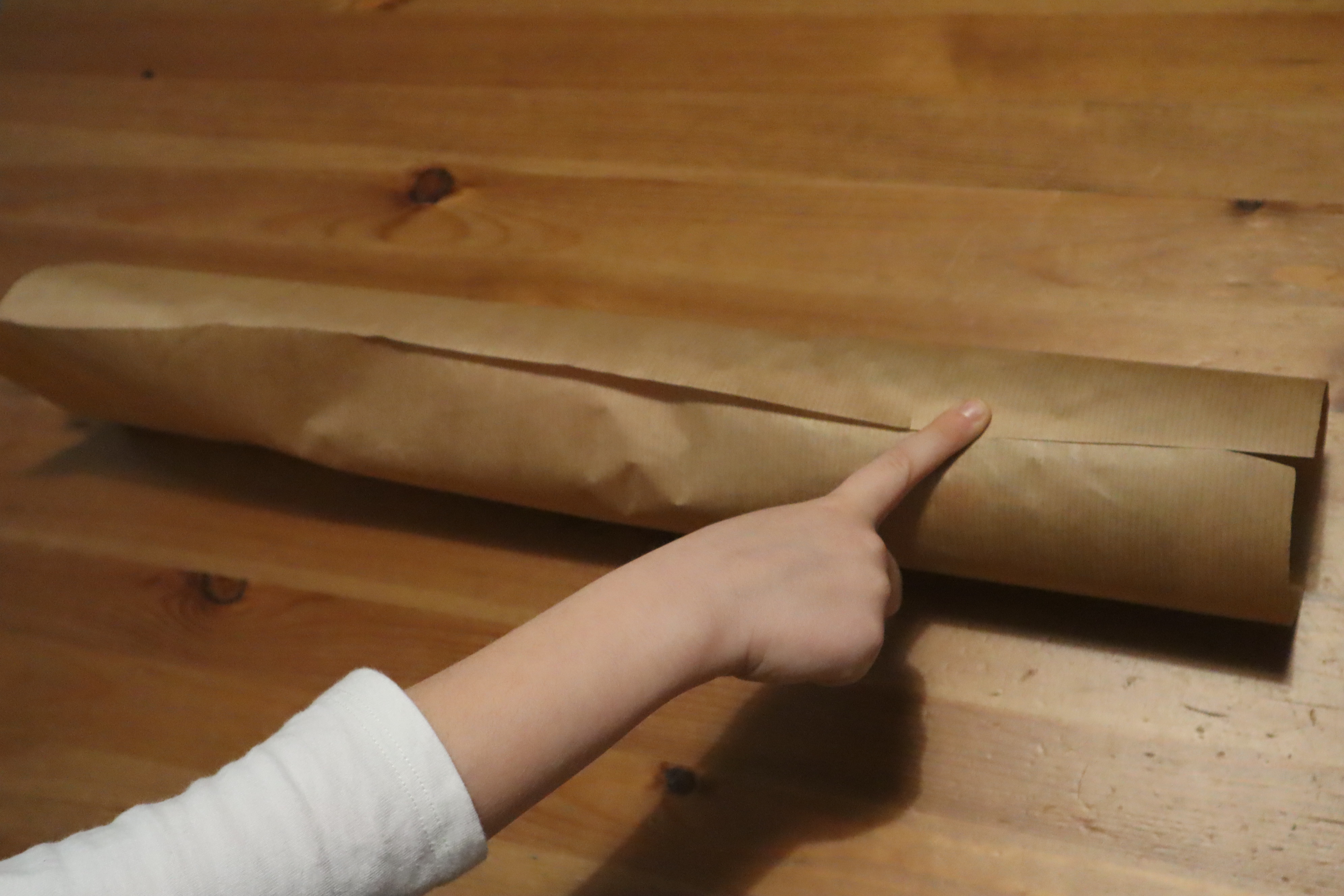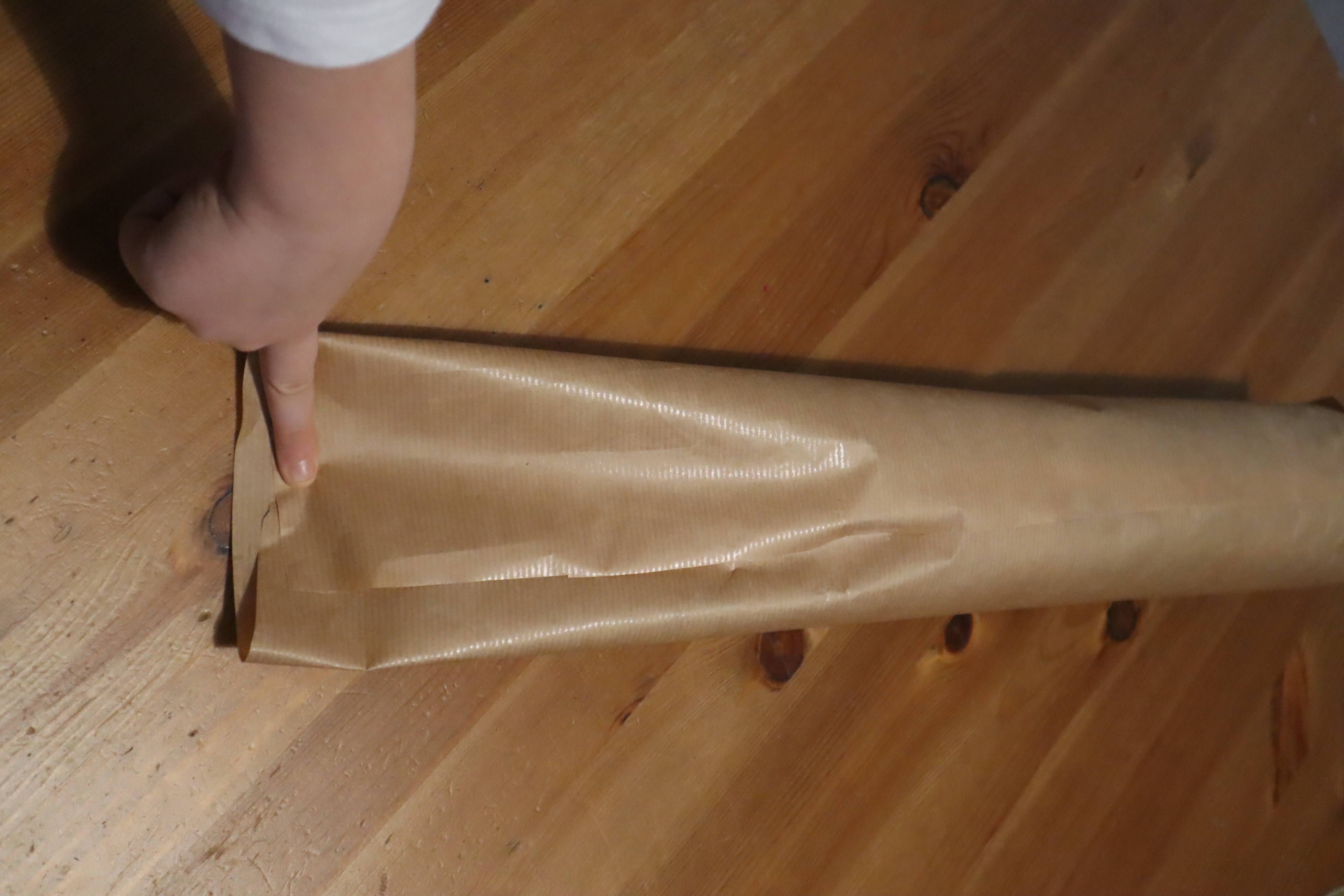 Krok 2 - układacie butelkę na jednym końcu i zawijacie w papier - zapezpieczacie taśmą na całej długości by powstała tuba o średnicy denka butelki.