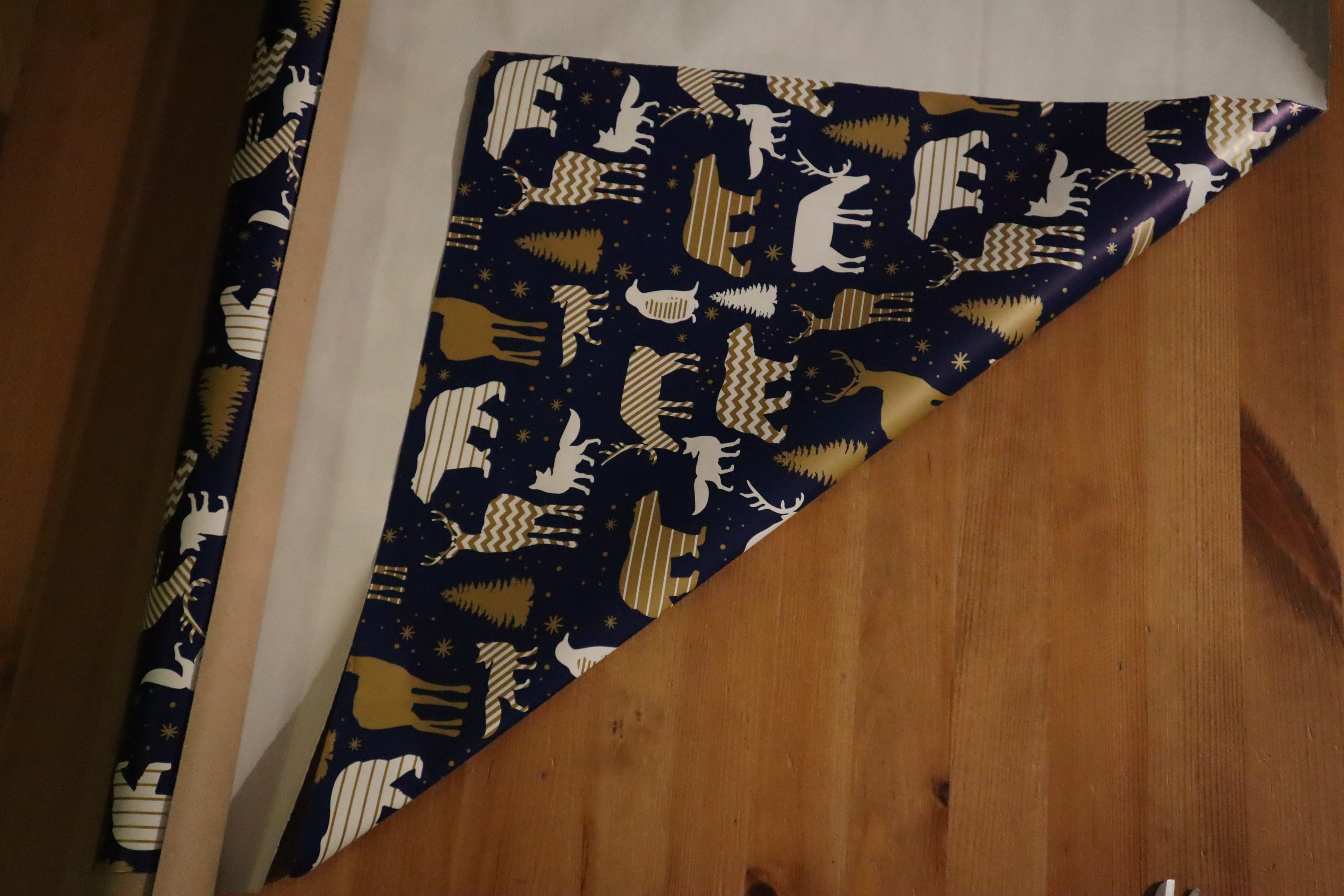 Krok 1 - ilość papieru - szerokość i wysokość pojedyncze pokrycie wszystkich ścian plus 10cm zapasu w obydwu kierunkach - papier musi mieć kształt kwadratu. NA zdjęciach najszybszy sposób zrobienia kwadratu o zadanej długości boku.