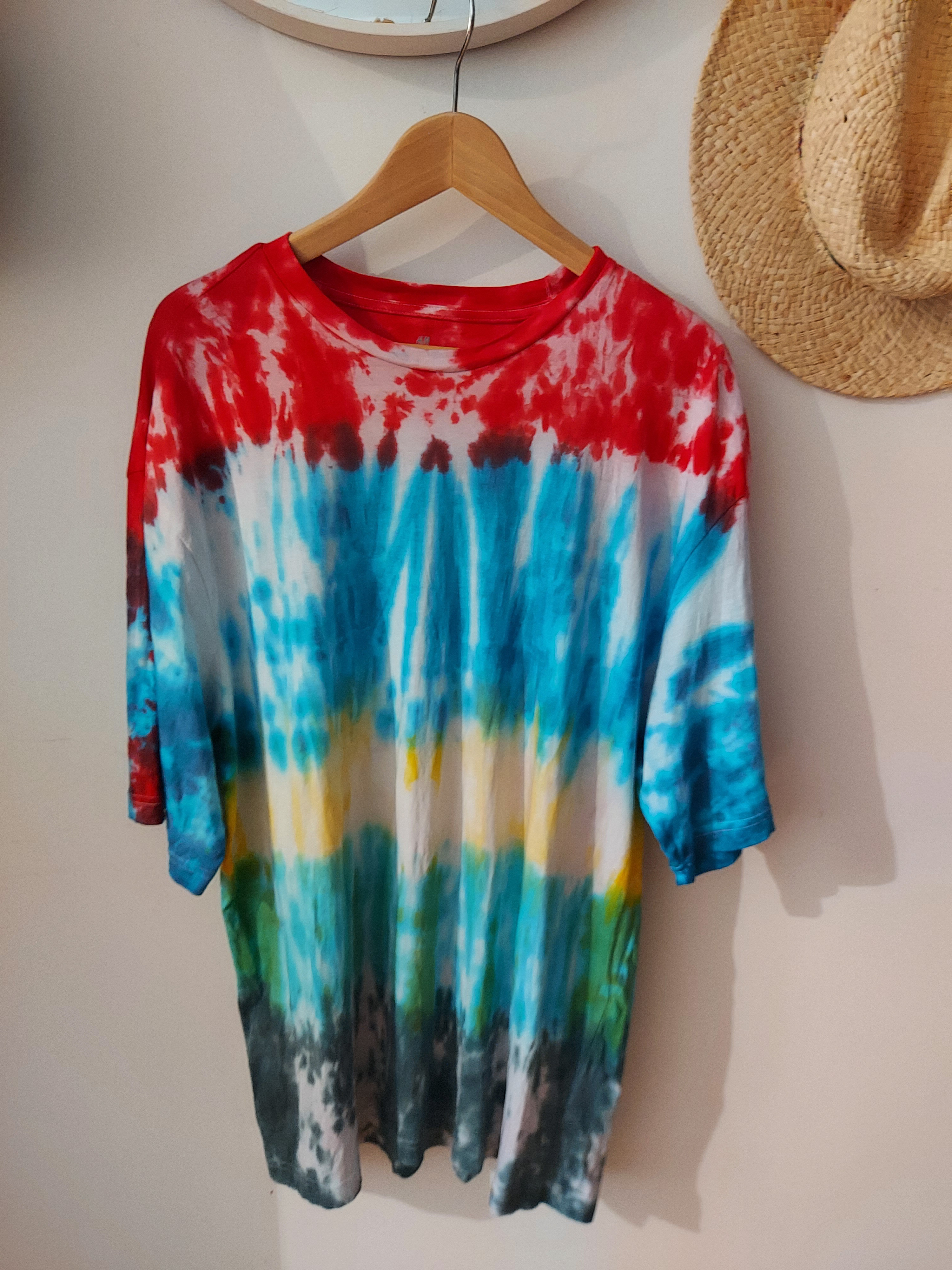 Nam z jednego zestawu udało się zafarbować aż 7 koszulek w tym dwie XXL , trzy L i dwie dziecięce , także gdy chciałoby się farbować jedynie dziecięce to i pół klasy załapie się na 1 opakowaniu barwników 😊. Poniżej efekt naszej zabawy 😊 Acha i fajny tip – znalazłam w szafie białą koszulkę, z plamkami które się już nie spierały i służyła mi jako „podomka” – postanowiłam spróbować ją zafarbować by da